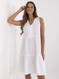Fedezze fel a stílus és a kényelem tökéletes kombinációját ezzel a fehér bővülő ruhával. Elegáns V-nyakú és ujjatlan dizájnja ideális a mindennapi viselethez, míg a finom fodor egy csipetnyi eleganciát ad. A ruha kiváló minőségű 100% pamutból készült, amely maximális kényelmet és légáteresztőséget biztosít. A ruha hossza térd fölé ér, és sima mintázata tökéletes választás a nyári napokra. Könnyedén kombinálhatja különböző kiegészítőkkel és lábbelikkel, így számos stílusos szettet alkothat. A 30 °C-on történő gépi mosás biztosítja, hogy a ruha sok mosás után is megőrizze megjelenését. Engedje, hogy elragadja szépsége és kényelme!
