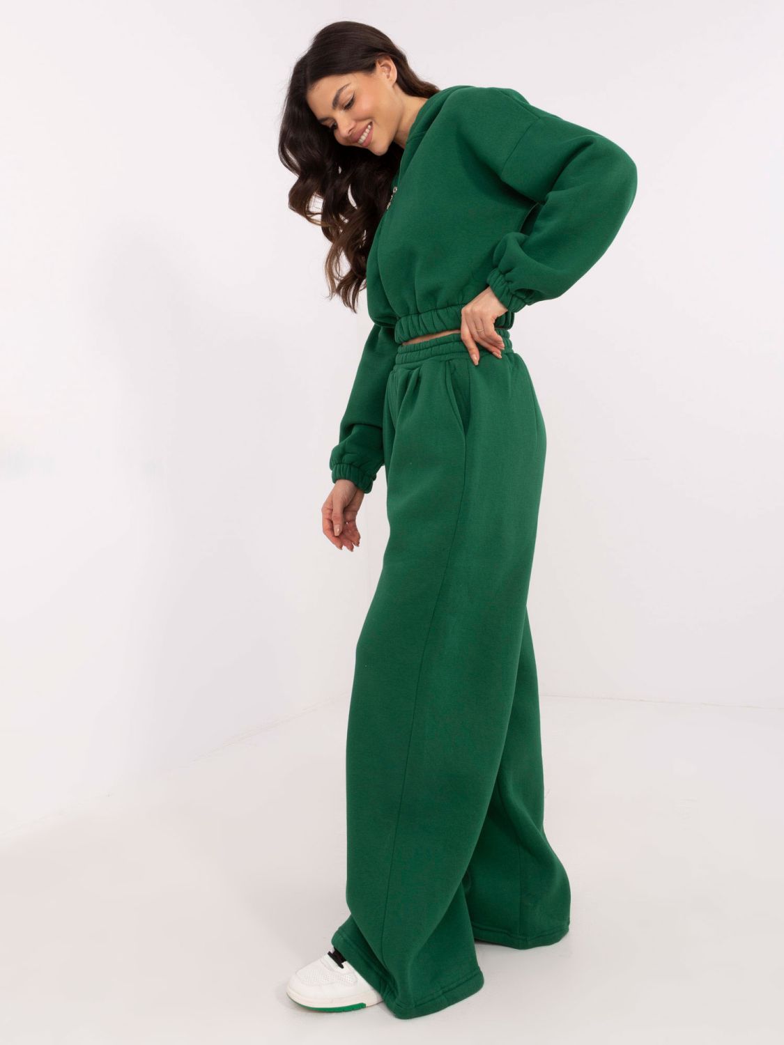 Fedezze fel a stílus és a kényelem tökéletes kombinációját ezzel az elegáns sötétzöld szettel. Ez a szett, amely hosszú ujjú kapucnis felsőből és széles nadrágból áll, ideális mindennapi viseletre. Kiváló minőségű pamutból (70%) és poliészterből (30%) készült, nemcsak kényelmet, hanem praktikusságot is kínál. A hosszú ujjú és magas derék biztosítja, hogy egész nap kényelmesen és stílusosan érezze magát. A szett emellett oldalsó zsebekkel és cipzárral van ellátva, ami növeli a funkcionalitását. Ne feledje, hogy ez a modell egy méretben kapható, amely alkalmazkodik az alakjához. Különböző alkalmakra alkalmas, ez a szett a kedvenc darabjává válik a ruhatárában.