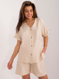Fedezze fel a stílus és a kényelem tökéletes kombinációját ezzel az elegáns, világos bézs színű szettel. Ez a szett, amely egy rövid ujjú blúzból és széles rövidnadrágból áll, ideális mindennapi viseletre. A V-nyakú, sima mintázatú blúz különböző alkalmakra is tökéletes, míg a magas derekú, oldalsó zsebes rövidnadrág praktikus megoldást kínál az egész öltözethez. A 50% pamut és 50% poliészter kiváló minőségű keverékéből készült, ez a szett nemcsak stílusos, hanem kényelmes és könnyen karbantartható is. 30 °C-on mosható, így egyszerűen tisztán tartható. A képen látható modell S/M méretet visel, magassága 173 cm, melle 90 cm, dereka 64 cm, csípője 91 cm. Ez a szett nagyszerű választás minden modern nő számára, aki a minőség és a stílus kombinációját keresi.